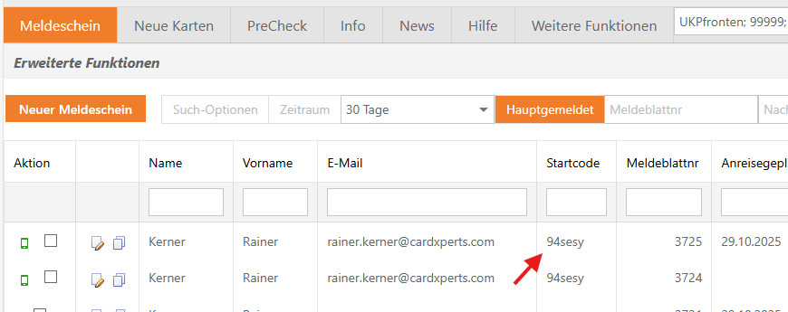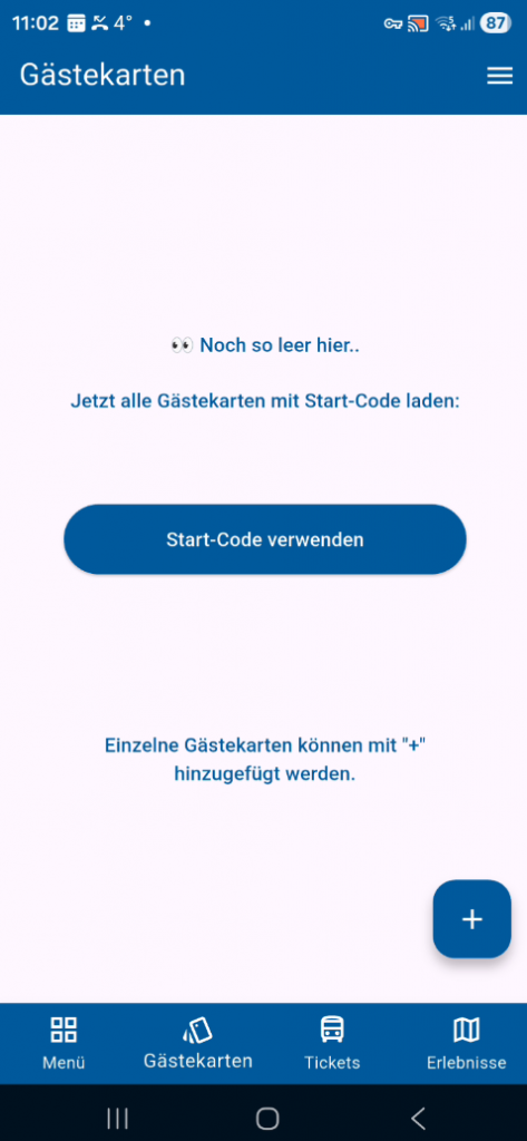 Der Gast gibt den Startcode in der App ein. Damit werden die Karten auf die E-Mail umgebucht, die der Gast verwendet hat. Den Startcode findet der Gast entweder in seiner E-Mail, oder du kannst diesen dem Gast selbst mitteilen. Den Startcode findest du in der Meldescheineliste
