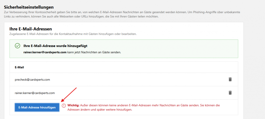 Damit die Mail zugestellt werden kann, müssen sie einmalig unsere Absenderadresse in ihrem booking.com – Account hinzufügen.