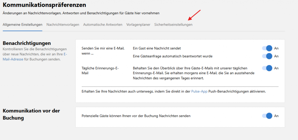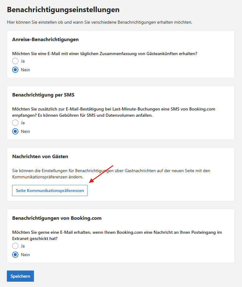 Unter “Nachrichten von Gästen” klicken Sie auf “Seite Kommunikationspräferenzen”.
