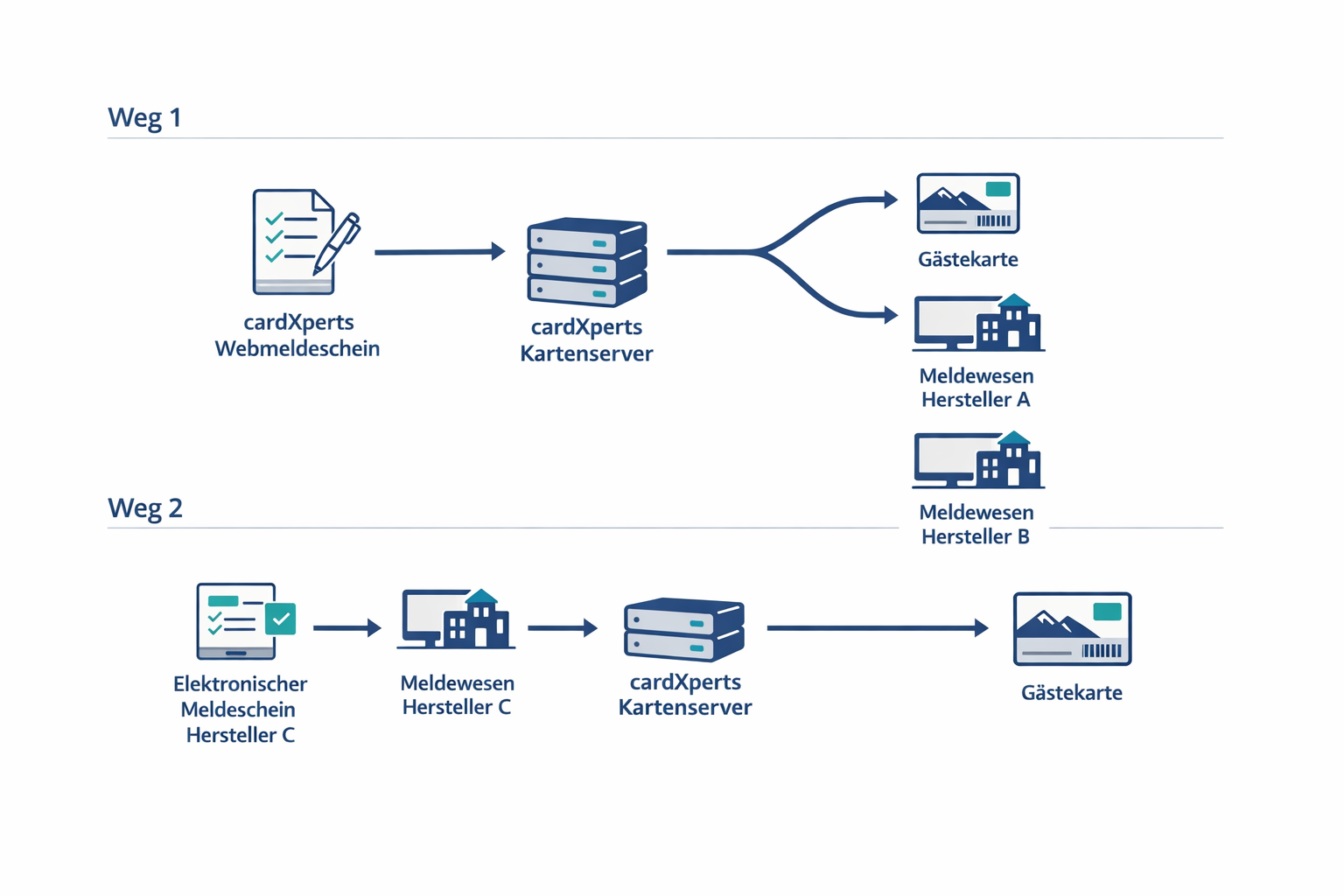 Der cardXperts Meldeschein übergibt Meldedaten an das vorhandene System (Hersteller A/B/C) – je Ort. Jede Gemeinde behält ihr bestehendes Meldewesenprogramm.