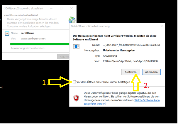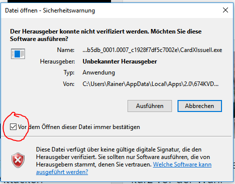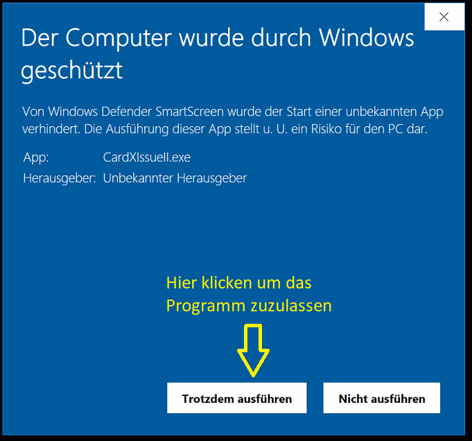 Daher können Sie die Ausführung des Programmes nicht zulassen und cardXissue startet nicht.