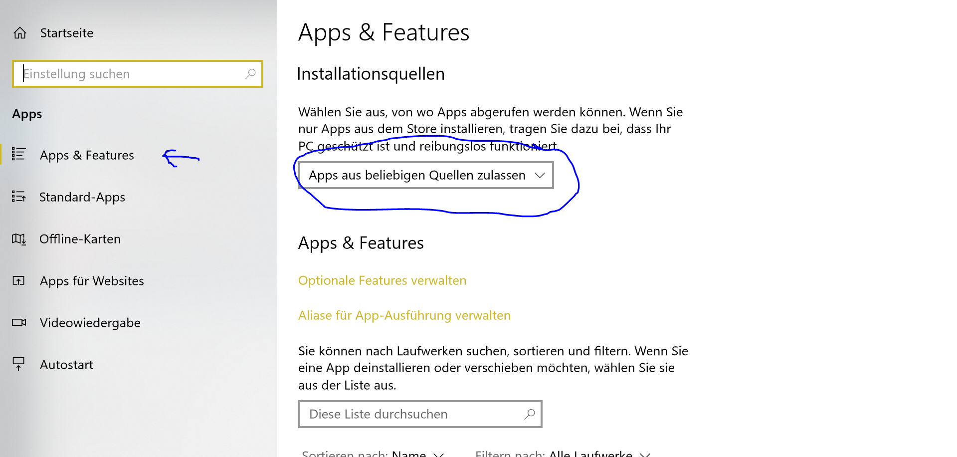 Im folgenden Bildschirm wählen Sie bitte Apps&Features.