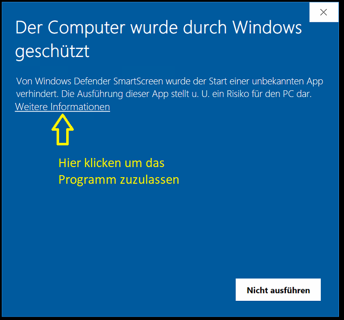 Sollten Sie die Windows eigene Sicherheitssoftware „Defender“ nutzen, erhalten Sie folgende Meldung:
