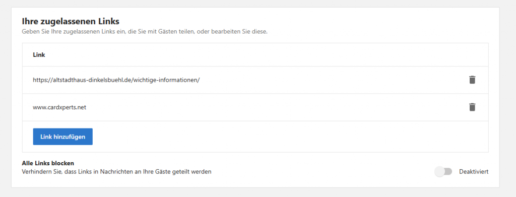 Damit booking.com Links in der Kommunikation zulässt – z.B. der PreCheck – Link oder die Einladung zur Digitalen Gäste – müssen Sie unsere Domain zu ihren erlaubten Links hinzufügen.